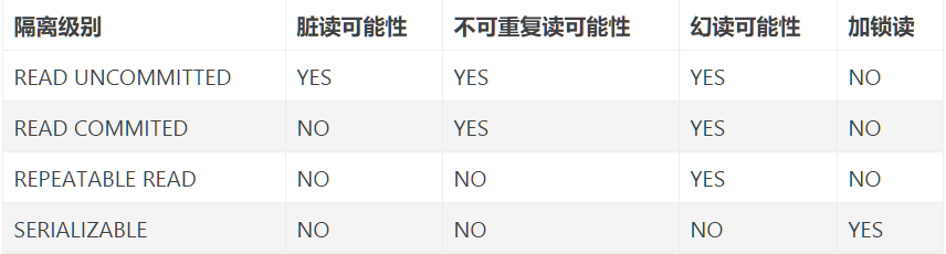 - SERIALIZABLE(可串行化):这个级别是最高的隔离级别,通过强制事务串行执行,避免了幻读问题。即会再读取的每一行数据上都加上锁,所以可能导致大量的超时和锁争用问题,只要在非常需要确保数据一致性而且可以接受没有并发的情况下,才考虑使用该级别。
