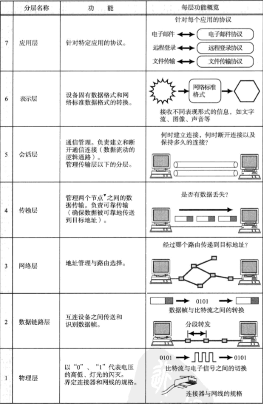 OSI参考模型将复杂的网络协议整理并分为易于理解的7个分层,对通信中必要的功能做了很好的归纳。不过,OSI参考模型始终是一个模型,它也只是对各层的作用做了一系列粗略的界定,并没有对协议和接口进行详细的定义。