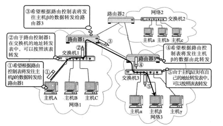 - 主机A先查看自己的路由控制表,在根据此表将发往主机B的数据先发给路由器1。