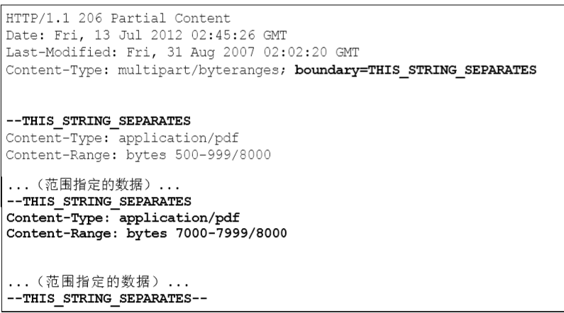 针对范围请求,响应会返回状态码206 Partial Content的响应报文。另外,对于多重范围的范围请求,响应会在首部字段Content-Type标明multipart/byteranges后返回响应报文。