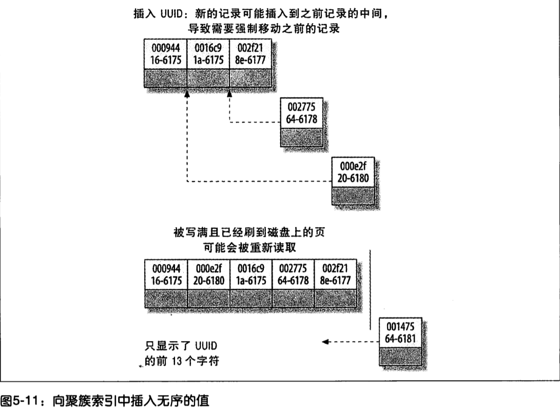 - 因为写入是乱序的,InnoDB不得不频繁的做分页操作,以便为新的行分配空间。页分裂会导致移动大量数据,一次插入最少需要修改三个页面而不是一个页面。