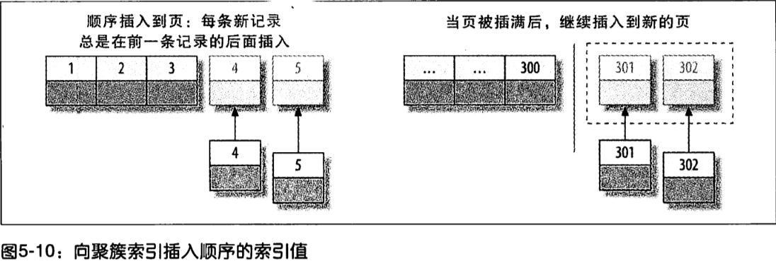 如图所示,因为主键的值是顺序的,所以InnoDB把每一条记录都存储在上一条记录的后面。当达到页的最大填充因子时(InnoDB默认的最大填充因子是页大小的15/19,留出部分空间用于以后修改),下一条记录就会写入新的页中。一旦数据按照这种顺序的方式加载,主键页就会近似于被顺序的记录填满,这也正是所期望的结果。