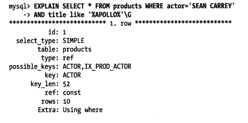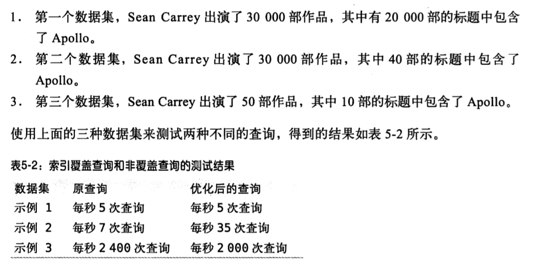 当发起一个被索引覆盖的查询(也叫做索引覆盖查询)时,在EXPLAIN的Extra列可以看到“Using index”的信息。索引覆盖查询还有很多陷阱可能导致无法实现优化。MySQL查询优化器会在执行查询前判断是否有一个索引能进行覆盖。加入索引覆盖了WHERE条件中的字段,但是不是整个查询涉及的字段。如果条件为假,MySQL5.5及更早总是会回表获取数据行,尽管并不需要这一行且最终会被过滤掉。