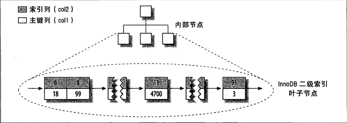 MyISAM中主键索引和其他索引在结构上没什么不同,因此列col2的索引分布和col1一样。主键索引就是一个名为PRIMARY的唯一非空索引。