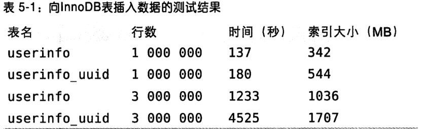 如果正在使用的InnoDB表没有什么数据需要聚集,那么可以定义一个与数据无关的代理键作为主键,最简单方法就是使用AUTO_INCREMENT自增列,这样可以保证数据行是按顺序写入,对于根据主键做关联的性能也会更好。最好避免随机的聚簇索引,下面对比以自增的整数ID作为主键和以随机字符串UUID作为主键的情况。