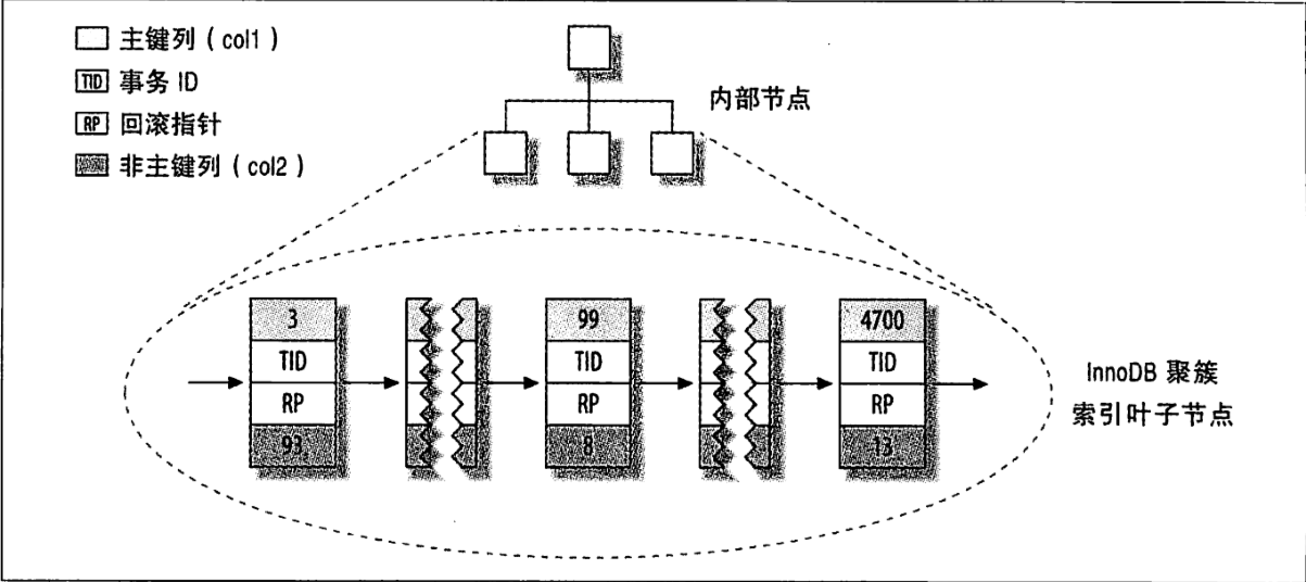 可以看到该图显示了整张表,而不只有索引,因为在InnoDB中,聚簇索引就是表,所以不需要像MyISAM那样需要独立的行存储。聚簇索引的每一个叶子节点都包含了主键值、事务ID、用于事务和MVCC的回滚指针以及所有的剩余列。