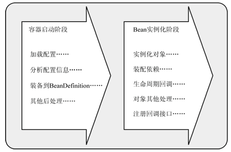 Spring的IoC容器实现以上功能的过程,基本上分为两个阶段:容器启动阶段和Bean的实例化阶段。