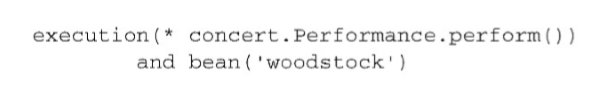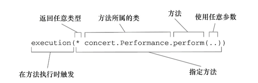 Performance可以代表任何类型的现场表演,假设我们想编写Performance的perform()方法触发的通知,下面展示了一个切点表达式,这个表达式能够设置当perform()方法执行时触发通知的调用: