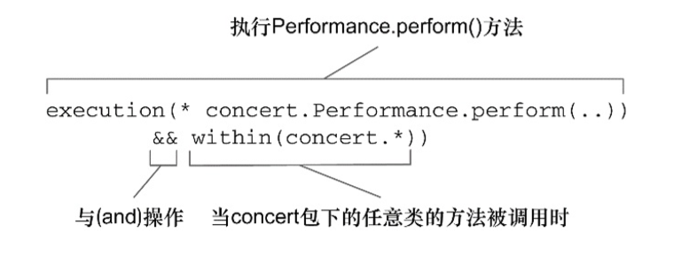 我们使用execution()指示器选择Preformance的perform()方法。方法表达式以“*”号开始,表明我们不关心方法返回值的类型。然后我们指定了全限定类名和方法名。对于方法参数列表,我们使用两个点号(..)表明切点要选择任意的perform()方法,无论该方法的入参是什么。假设我们需要配置的切点仅匹配concert包,可以使用within()指示器来限制匹配。使用“&&”来表示与的关系,“||”和“!”也同理: