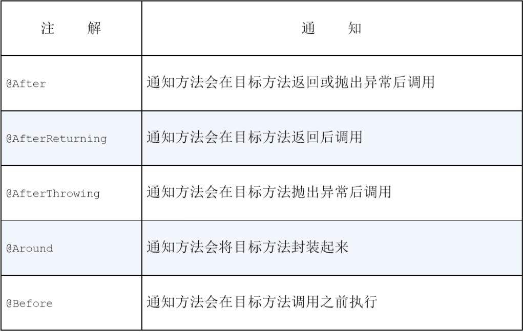 - 通知(Advice):通知定义了切面是什么以及何时使用。除了描述切面要完成的工作,通知还解决了何时执行这个工作的问题。因此可以说,切面的工作被称为通知。Spring切面可以应用5种类型的通知:
