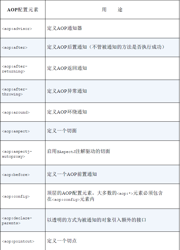 除了使用注解的方式,还可以考虑使用XML文件配置的方式。在Spring的aop命名空间中,提供了多个元素用来在XML中声明切面,如下表: