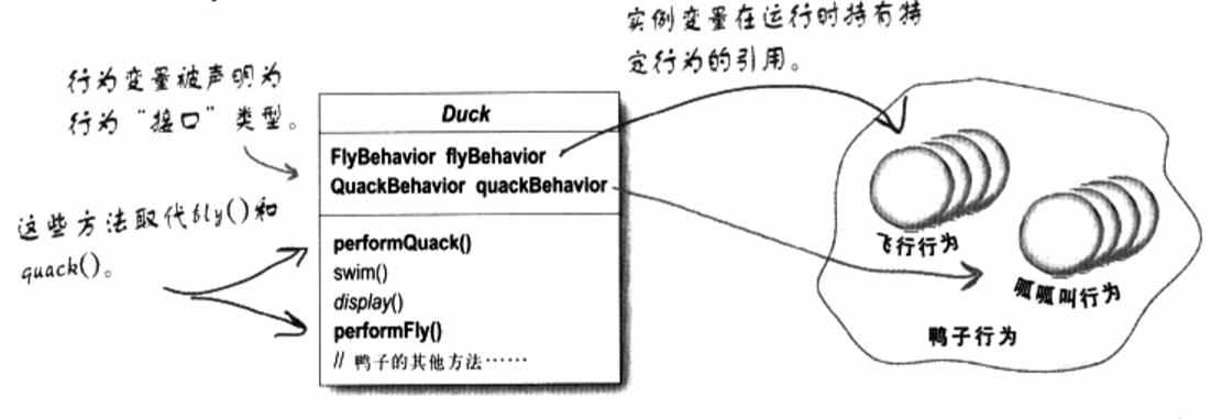 想进行呱呱叫的动作,Duck对象只要交quackBehavior对象去呱呱叫就行了,想要飞的行为,只要叫flyBehavior对象