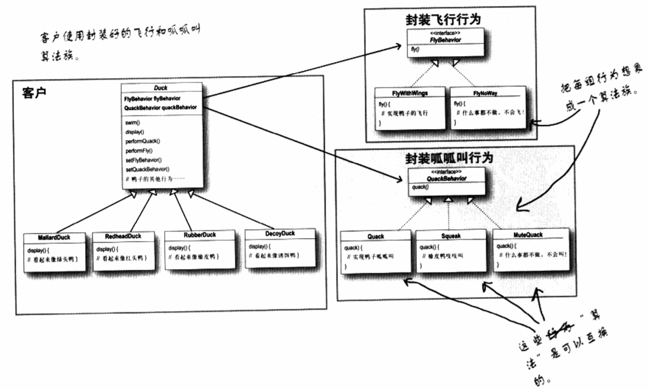 我们把描述事情的方式稍有改变,不再把鸭子的行为说成是“一组行为”,我们开始把行为想成是“一族算法”,现在回到策略模式的定义上面再看就豁然开朗:
