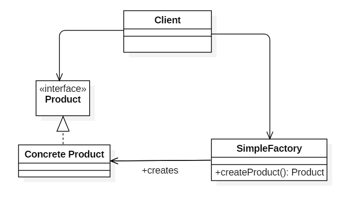 然后提供SimpleFactory类,作为一个工厂,当客户端需要Product时,只需去向SimpleFactory这个工厂去获取相对应的具体实现类即可: