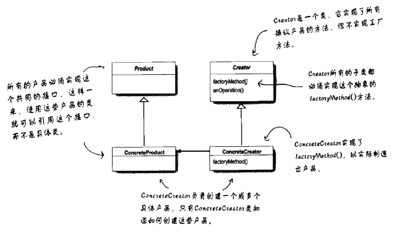 - 工厂方法使用继承:把对象的创建委托给子类,子类实现工厂方法来创建对象。