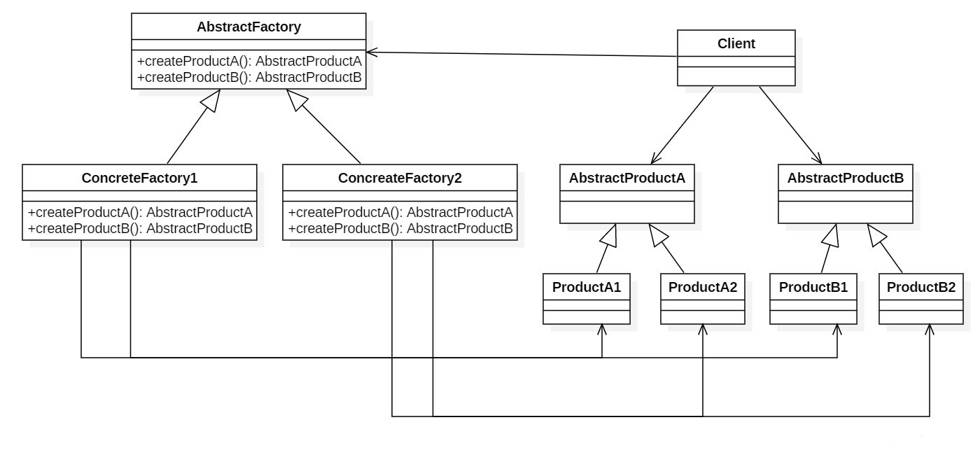 - 抽象工厂使用对象组合:对象的创建被实现在工厂接口所暴露出来的方法中。