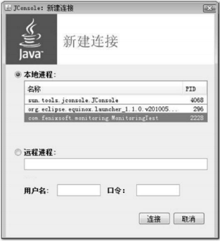 提供JDK/bin目录下的“jconsole.exe”启动JConsole后,将自动搜索出本机运行的所有虚拟机进程,双击选择其中一个进程即可开始监控,也可以使用下面的“远程进程”功能来连接远程服务器,对远程虚拟机进行监控。