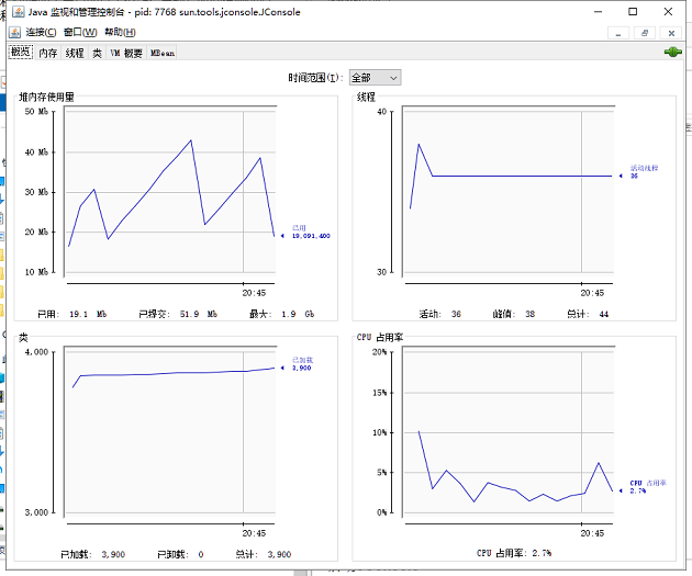 “概述”页签显示的是整个虚拟机主要运行数据的概览,其中包括“堆内存使用情况”、“线程”、“类”、“CPU使用情况”4种信息的曲线图。