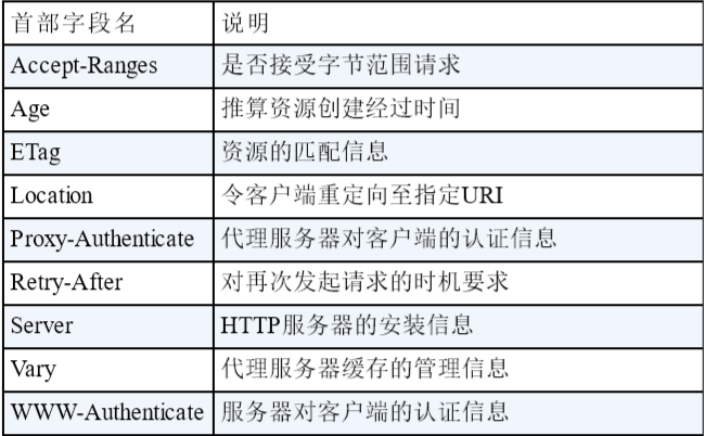 - 响应首部字段:从服务器端向客户端返回响应报文时使用的首部。补充了相应的附加内容,也会要求客户端附加额外的内容信息。