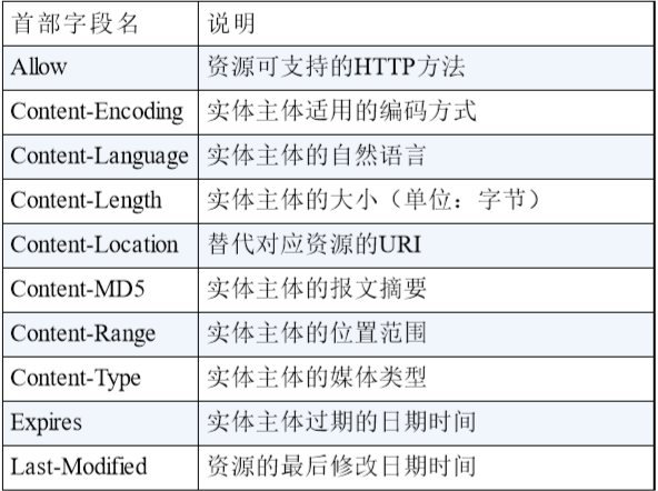 - 实体首部字段:针对请求报文和响应报文的实体部分使用的首部。补充了资源内容更新时间等与实体有关的信息。