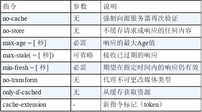 通过指定首部字段Cache-Control的指令,就能操作缓存的工作机制。指令的参数是可选的,多个指令之间通过“,”分隔。首部字段Cache-Control的指令可用于请求及时响应。下面是Cache-Control指令一览: