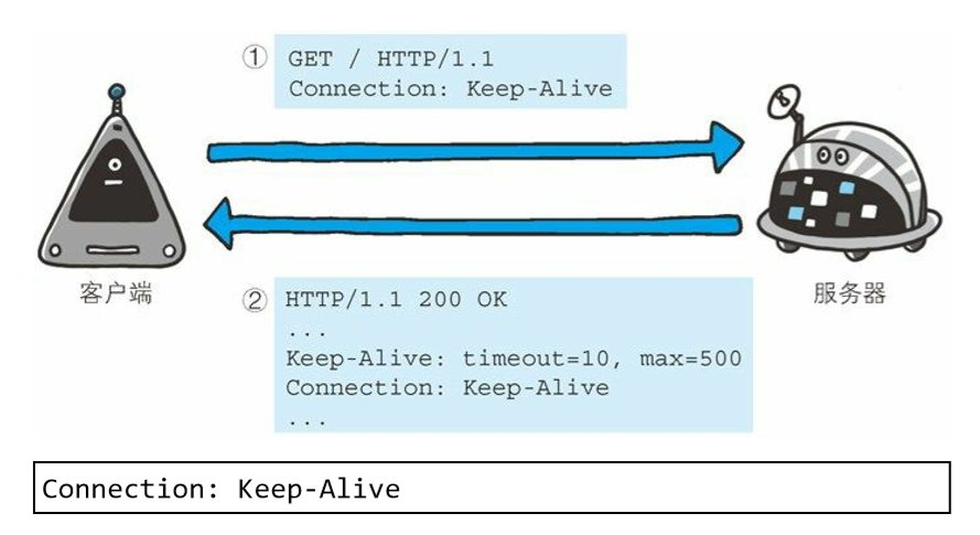 HTTP/1.1版本的默认连接都是持久连接。为此,客户端会在持久连接上连续发送请求。当服务器端想明确断开连接时,则指定Connection首部字段的值为Close。HTTP/1.1之前的HTTP版本的默认连接都是非持久连接。为此如果想在旧版本的HTTP协议上维持持久连接,则需要指定Connection首部字段的值为Keep-Alive。服务器就会如图上一样加上首部字段Keep-Alive及首部字段Connection后返回响应。