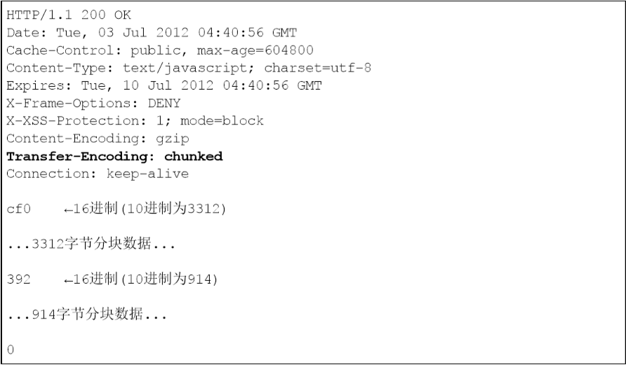 上图正证如在首部字段Transfer-Encoding中指定的那样,有效使用分块传输编码,且分别被分成3312字节和914字节大小的分块数据。